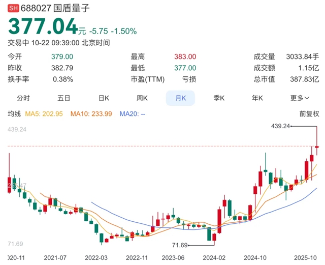 国内量子计算概念股,国盾量子过去一年的股价涨幅约80%,最新市值达到了387.83亿元人民币(约合54.44亿美元)。