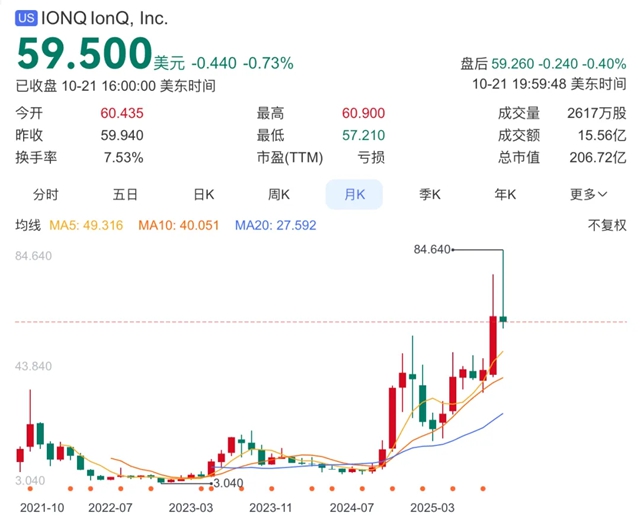 IonQ在过去一年的股价涨幅约300%,最高涨幅约464%,最新市值206.72亿美元。