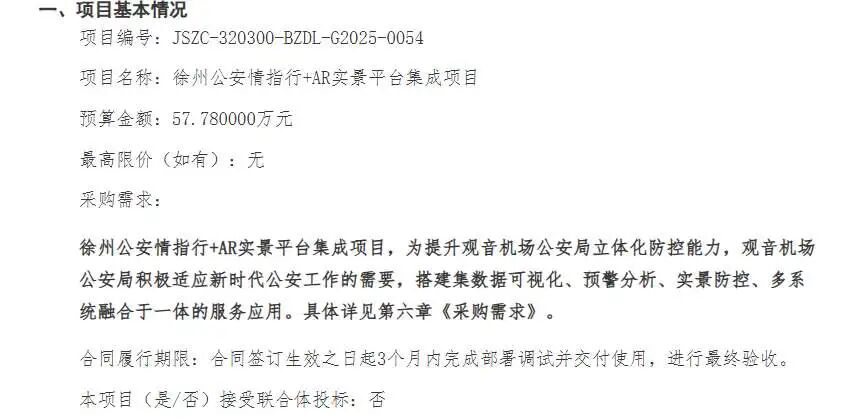 (映维网Nweon 2025年09月24日)徐州市公安局发布公告,计划以57.78万元开展徐州公安情指行+AR实景平台集成项目。